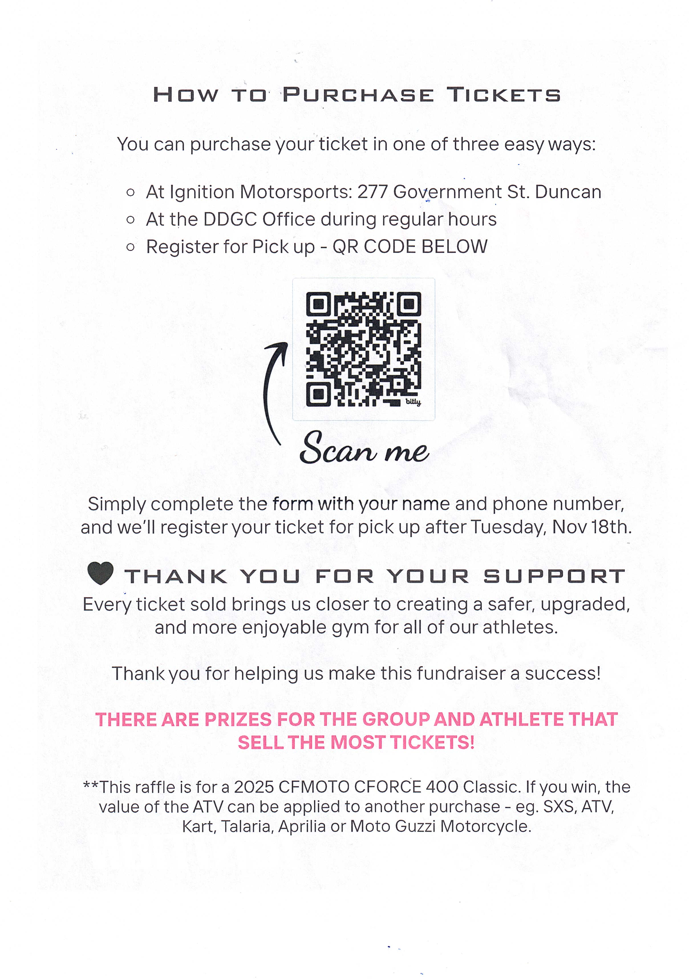 Winter 2026 classes -- limited spots still available.*late fee applies News WANT TO WIN AN ATV? posted Nov 20, 2025, 2:57 PM Click here for the link if the QR doesn't scan! win this ATV.pdfPrevious Next